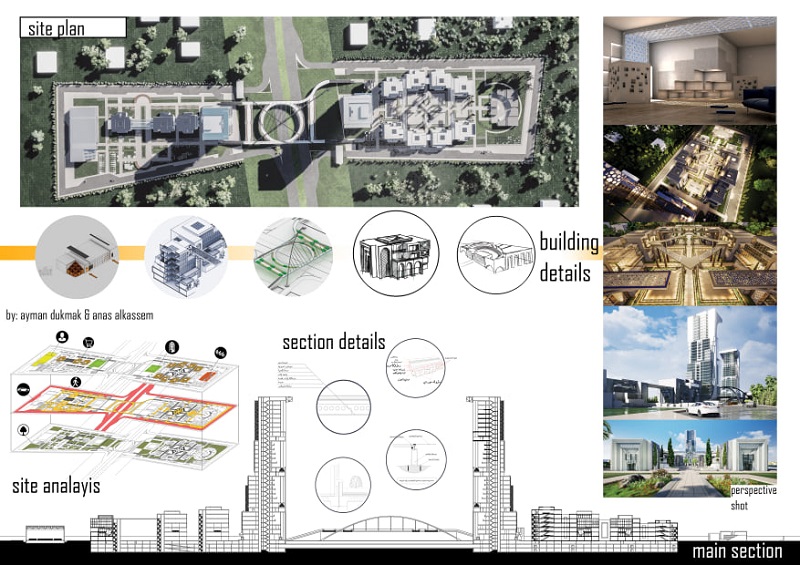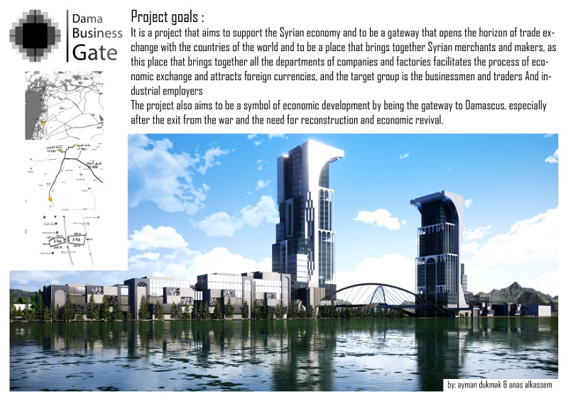 مشروع استثماري من أجل دعم الاقتصاد السوري عن طريق إدارة التبادل التجاري ليكون تجمعاً لكل الفعاليات الاقتصادية ، حيث يوفر بيئة تفاعلية لأصحاب المعامل والشركات المحلية والخارجية لاكتشاف فرص الاستثمار كافة وسوق العمل والكفاءات المختلفة . اعتمدت فكرة التصميم على ابتكار نقطة علام في المدخل الجنوبي لمدينة دمشق ، وذلك من خلال اقتراح بوابة ضمن تشكيل حجمي لبرجين متوضعين على طرفي أوتستراد درعا الرئيسي . تم ربط الكتلتين بجسر مشاة تفاعلي لخلق الأجواء التشاركية في حيز التنقل بين المنطقتين. اعتمدت فلسفة التصميم بعناصره المكونة على تطوير عناصر العمارة المحلية بكافة مستوياتها ، وتعزيز مفهوم الفراغات العامة واستثمارها بالشكل الأمثل . |