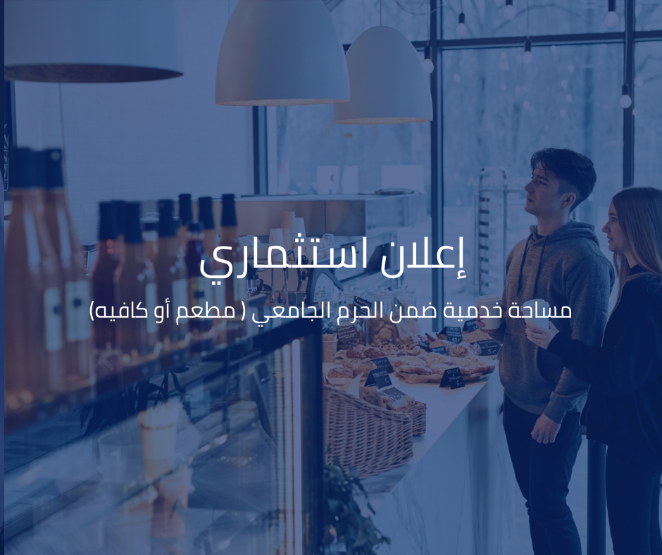 ندعو الراغبين بالاستثمار إلى تقديم عرض العمل مفصلاً (يشمل الفكرة، الخدمات، الأسعار المقترحة، والخبرة السابقة إن وجدت)، وذلك في مكتب الجامعة – المزة، أوتستراد، مقابل موقف طلعة الإسكان.