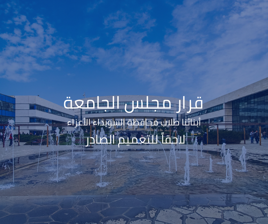 لاحقما للتعميم الصادر بتاريخ 18/5 بشأن الطلاب المنقطعين عن الدوام من محافظة السويداء ومن في حكمهم، اجتمع مجلس الجامعة مجددا واطلع على الطلبات المقدمة من بعض الطلبة، وبعد المناقشة تقرر مايلي: