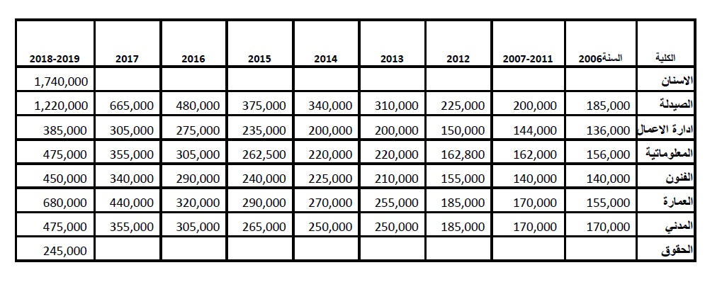 يبدأ التسجيل للفصل الدراسي الأول لعام 2020/2021 اعتباراَ من يوم السبت 10/10/2020 (لكل الكليات) وينتهي يوم الاربعاء 14/10/2020 شريطة ان يكون الطالب برئ الذمة مالياً عن الفصول الدراسية السابقة ، وان يسدد قسط الفصل الدراسي الأول كاملا عدا النقل و المبينة ضمن الجدول الملحق من تاريخ 20/09/2020 لغاية 8/10/2020 كحد أقصى او استكمال المبلغ في حال وجود رصيد سابق .