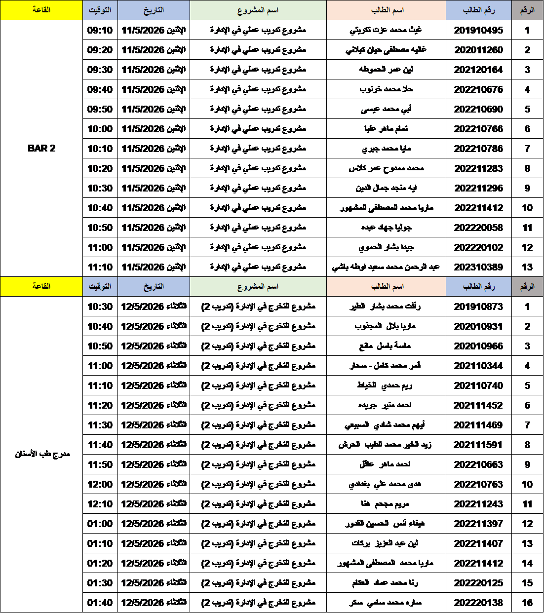 الطلاب الأعزاء في كلية إدارة الأعمال يحدد مواعيد مناقشة مشاريع التدريب 1 و2