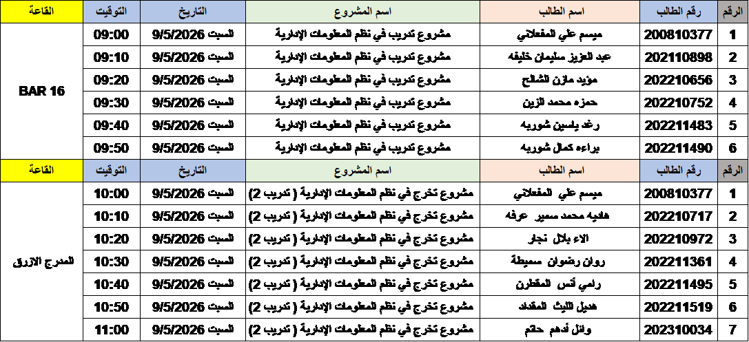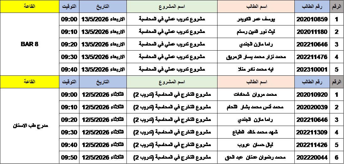 وفق المواعيد التالية(على الطلاب الإلتزام والتواجد وفق المواعيد المحددة ):
