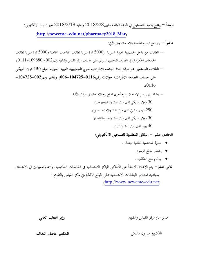إعلان بخصوص موعد امتحان الصيدلة الموحد دورة آذار 2018