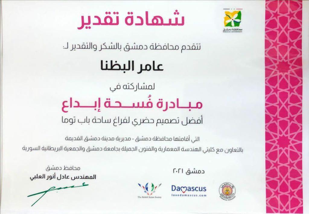 الجامعة العربية الدولية تحصد الجوائز الاولى والثانية والخامسة في مسابقة مبادرة فسحة ابداع التي كانت بعنوان : " التصميم الحضري للفراغ المحيط بساحة باب توما بدمشق القديمة " ، والتي نظمتها محافظة دمشق بالتعاون مع كليتي الهندسة المعمارية والفنون الجميلة بجامعة دمشق والجمعية البريطانية السورية، حيث فاز في المرتبة الاولى من الجامعة العربية الدولية م. عامر البظنا