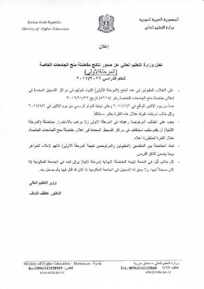 تعلن وزارة التعليم العالي عن صدور نتائج مفاضلة منح الجامعات الخاصة