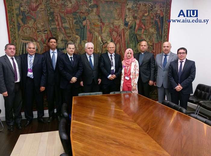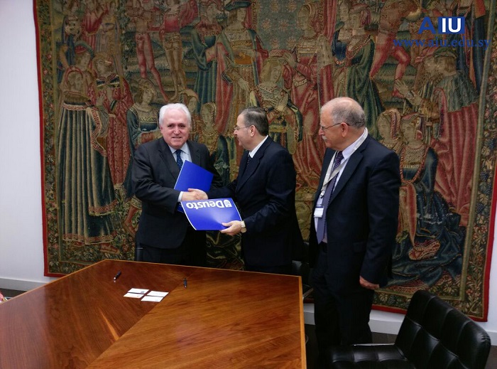 Following-up the efforts of the Arab International University to expand scientific agreements to include more highly qualified foreign universities,an agreement of scientific, research, exchange of students, professors, teaching programs, supervision of joint scientific and graduate studies cooperation was signed between the Arab International University represented by its president Prof. Dr. Mohammed Maher Kabbaguiba and the Spanish University of Deusto represented by its president, . Dr.D. Jose Maria Guibert Ucin on Tuesday 25/5/2016 in the city of Bilbao.
