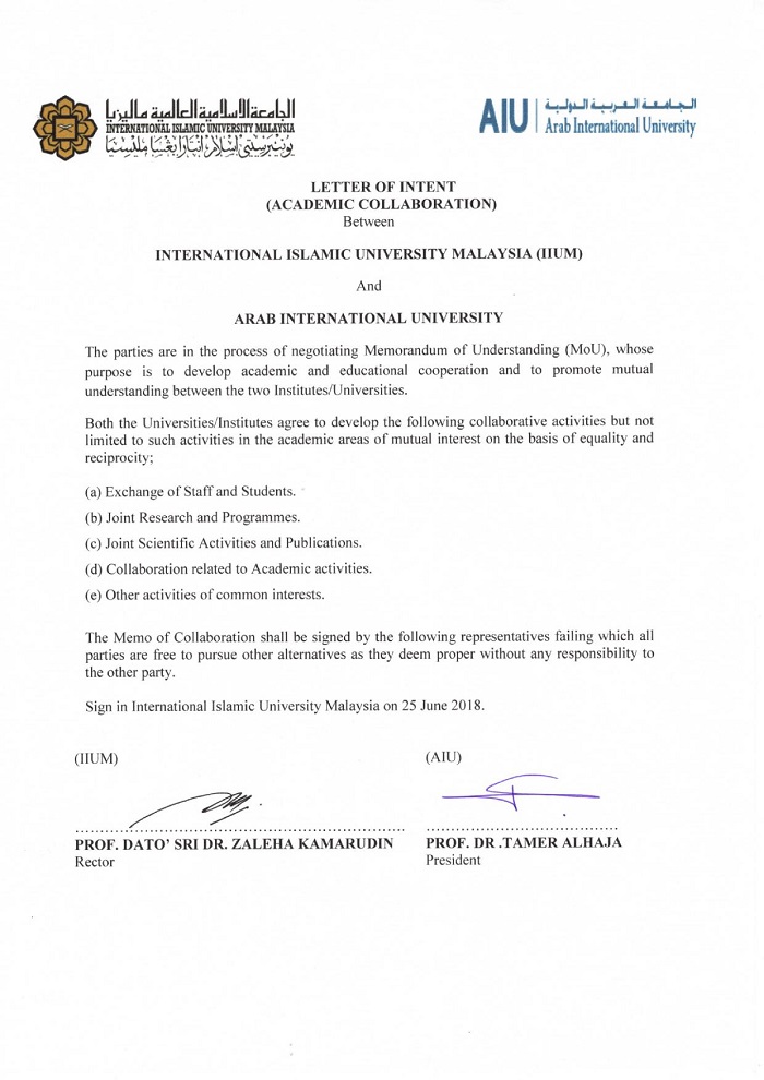 A letter of intent (for academic cooperation) was signed on 25/06/2018 between the International Islamic University of Malaysia and the Arab International University by the presidents of the two universities, Dr. Zelikha Qamaruddin and Dr. Tamer El-Hajja on the sidelines of The 3rd Arab-ASEAN International Conference on Higher Education which took place on 25 and 26/06/2018 with the participation of the President of the University, Dr. Tamer El-Hajja.