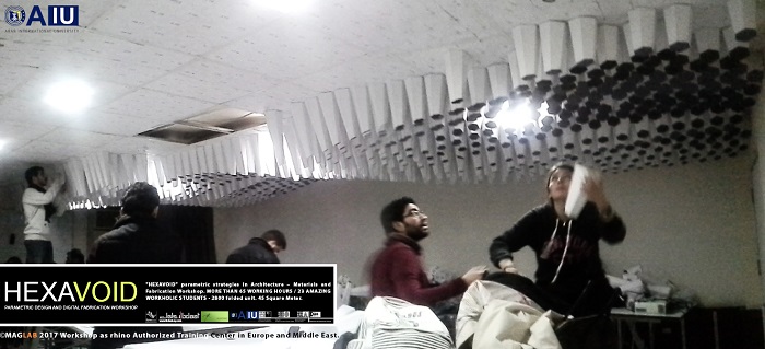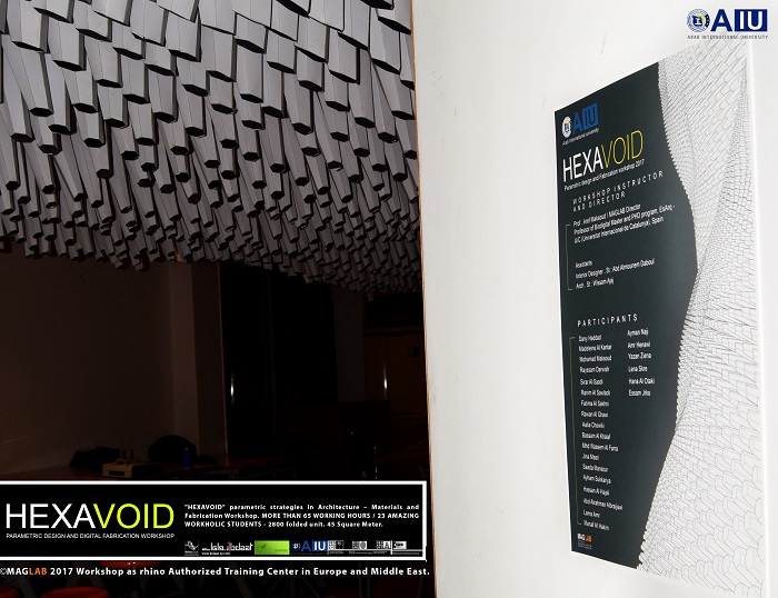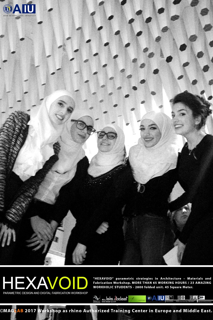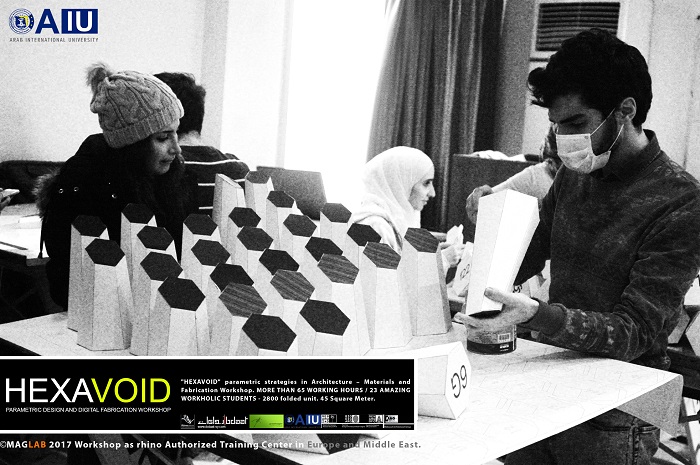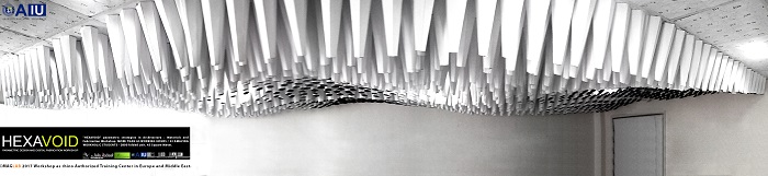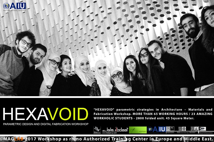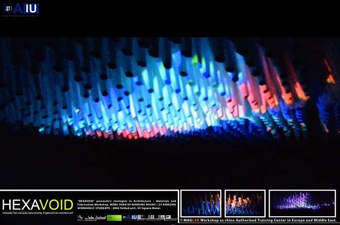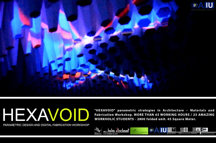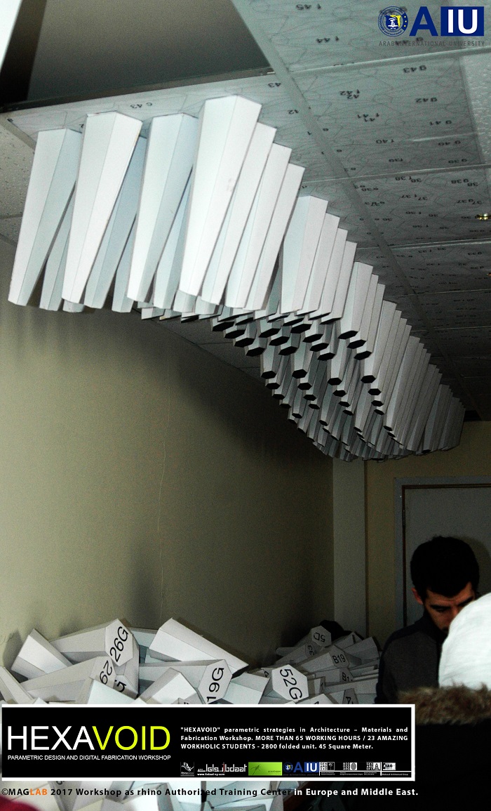 HEXAVOID Parametric design and Fabrication workshop 2017 "HEXAVOID" parametric strategies in Architecture – Materials and Fabrication Workshop. MORE THAN 65 WORKING HOURS / 23 AMAZING WORKHOLIC STUDENTS - 2800 folded unit. 45 Square Meter. Parametric design, Art and digital Fabrication Workshop “HEXAVOID 2017” In the intensive 7 days’ full time Workshop; we focused exclusively on introducing Morphogenesis, evolving strategies in architecture, Pattern finding and optimizing complex geometry in conjunction with economic efficiency, environmental impact. Participants experimented with new techniques, strategies using 3ds max and Rhino understanding of all stages from parametric design to digital manufacturing.