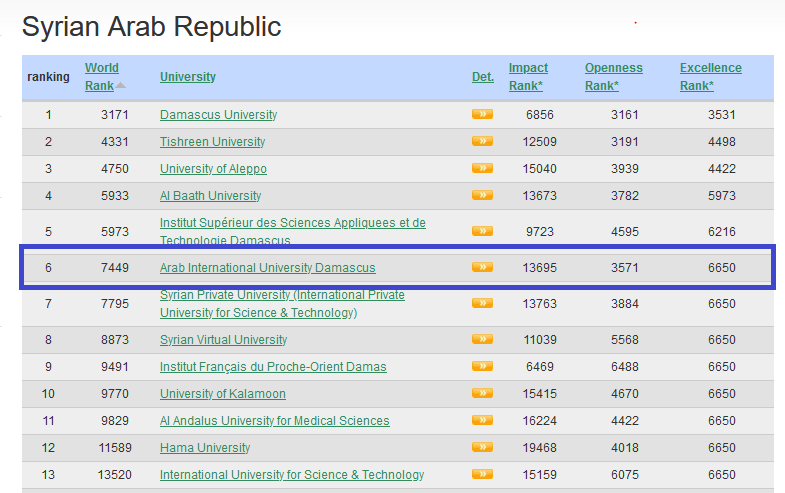 According to the results of webometrics for the month of July 2021, the Arab International University maintained its first rank among private universities in Syria and sixth rank among the Syrian public and private universities.