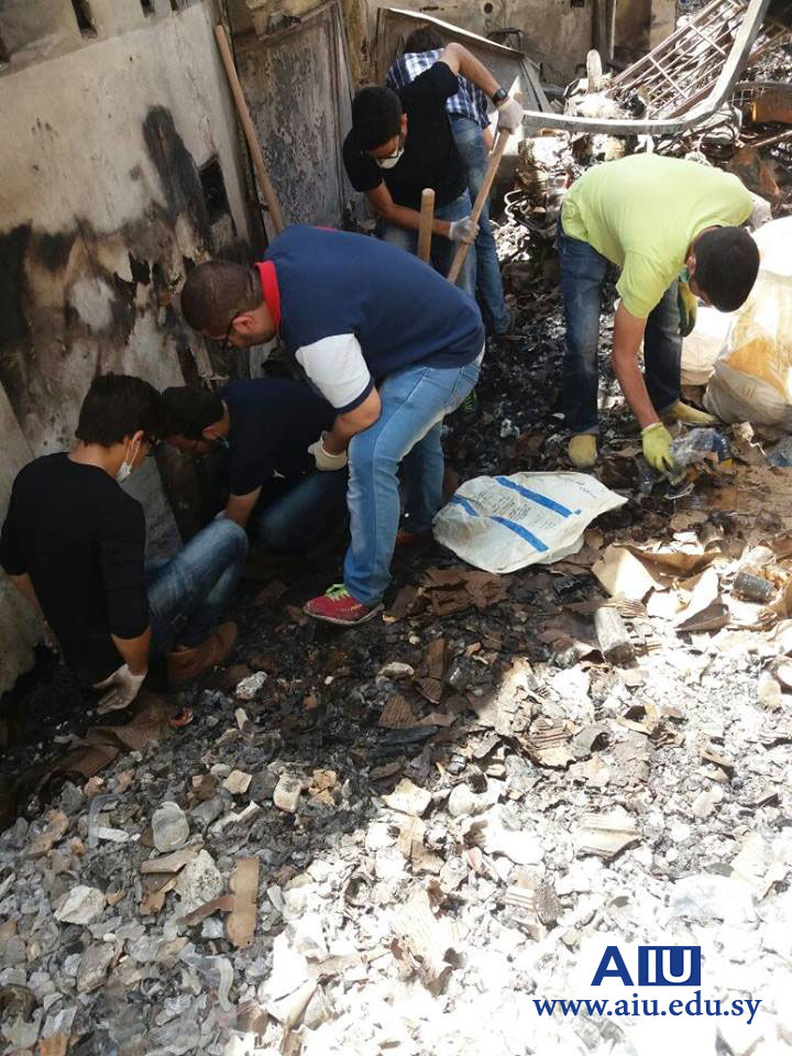 Under the slogan, (Sham is ours) Arab International University students participated in cooperation with the volunteer team and the National Union of Syrian Students to remove the rubble in Al-Asronya area in Damascus which was burned several days ago.