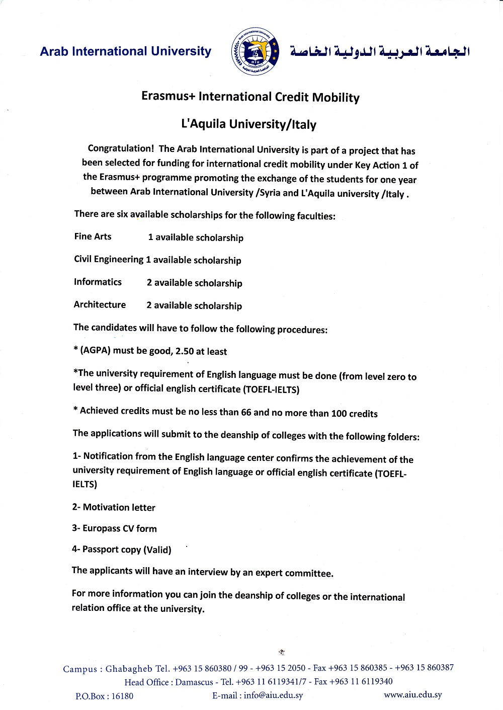 Announcement: Conditions of Scholarship to L'Aquila University / Italy.