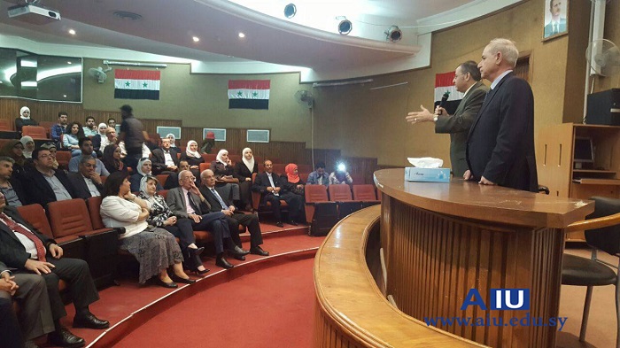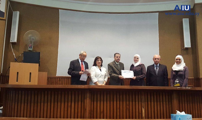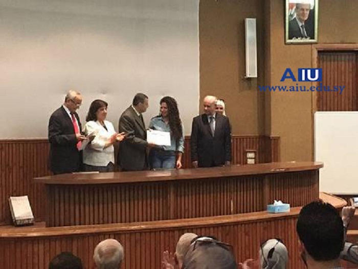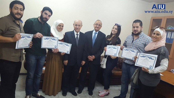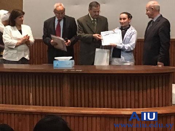 Under the auspices of Prof. Dr. Mohammed Maher Kabbaguibi, president of the private Arab International University, the Deanship of the Faculty of Pharmacy has honored the top students in the different years. The Deanship has as well honored the top three students who gained the highest grades in the National Exam. Both Dr. Mohammed Maher Kabbaguibi, the president of the university and Dr. Adel Nofel, the dean of the faculty have conferred the honors. The ceremony was attended by Dr. Marwan Zbibi, the vice president for the scientific affairs of the university, a number of the faculty doctors, students’ parents, the head of the Student Union Branch and members of the governing body of the faculty.