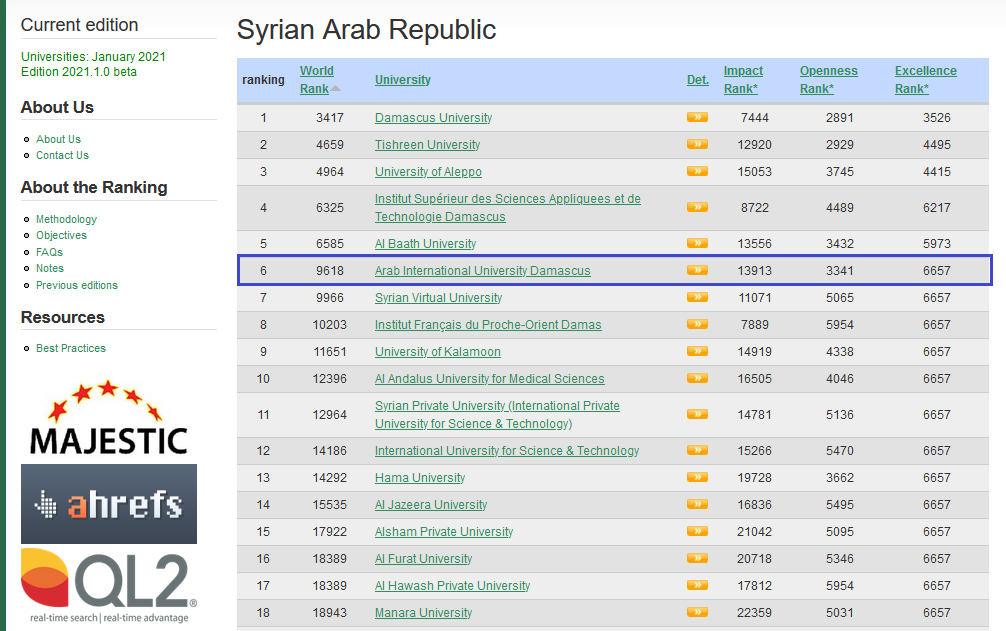According to the results of webometrics for the month of January 2021, the Arab International University ranked first among private universities in Syria and sixth place among the Syrian public and private universities.