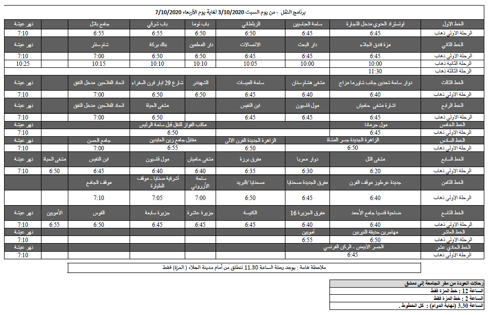 Transprtation Table- from Saturday 3/10/2020 until Wednesday 7/10/2020