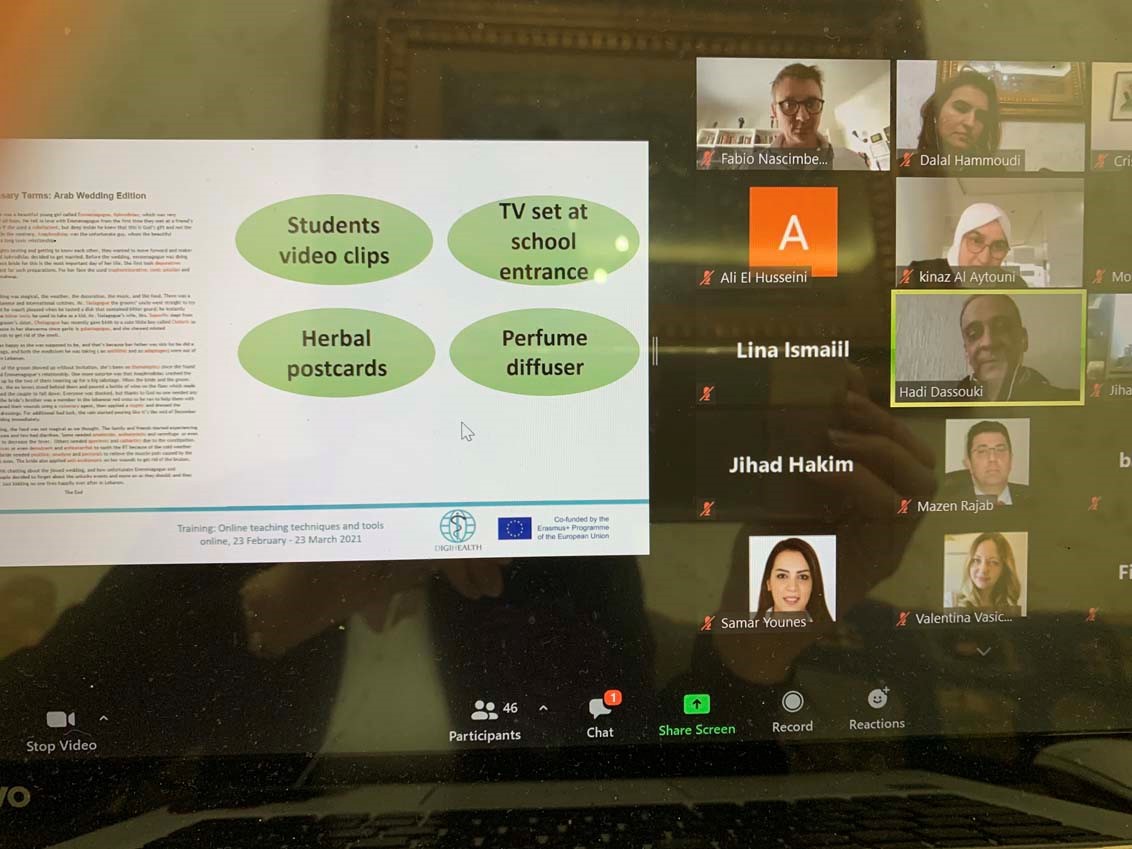 Arab International University participated in the second DIGIHEALTH project training of trainers held virtually on the period between February 23rd and March 23rd, 2021, and facilitated by the Mediterranean Universities Union (UNIMED). The second training module provided practical knowledge about online teaching techniques and tools, as a follow-up to the first training in Beirut where participants gained an understanding of modern online educational developments and trends. The training began with an introductory online workshop that was followed by three sessions on Collaborative learning, Gamification within e-learning and Open and inclusive teaching approaches. Participants from different universities in Lebanon, Syria, and Egypt, in addition to the trainers from Italy and Sweden joined the virtual sessions. The organizers acknowledged the impressive participation from AIU with 16 academic faculty participants.