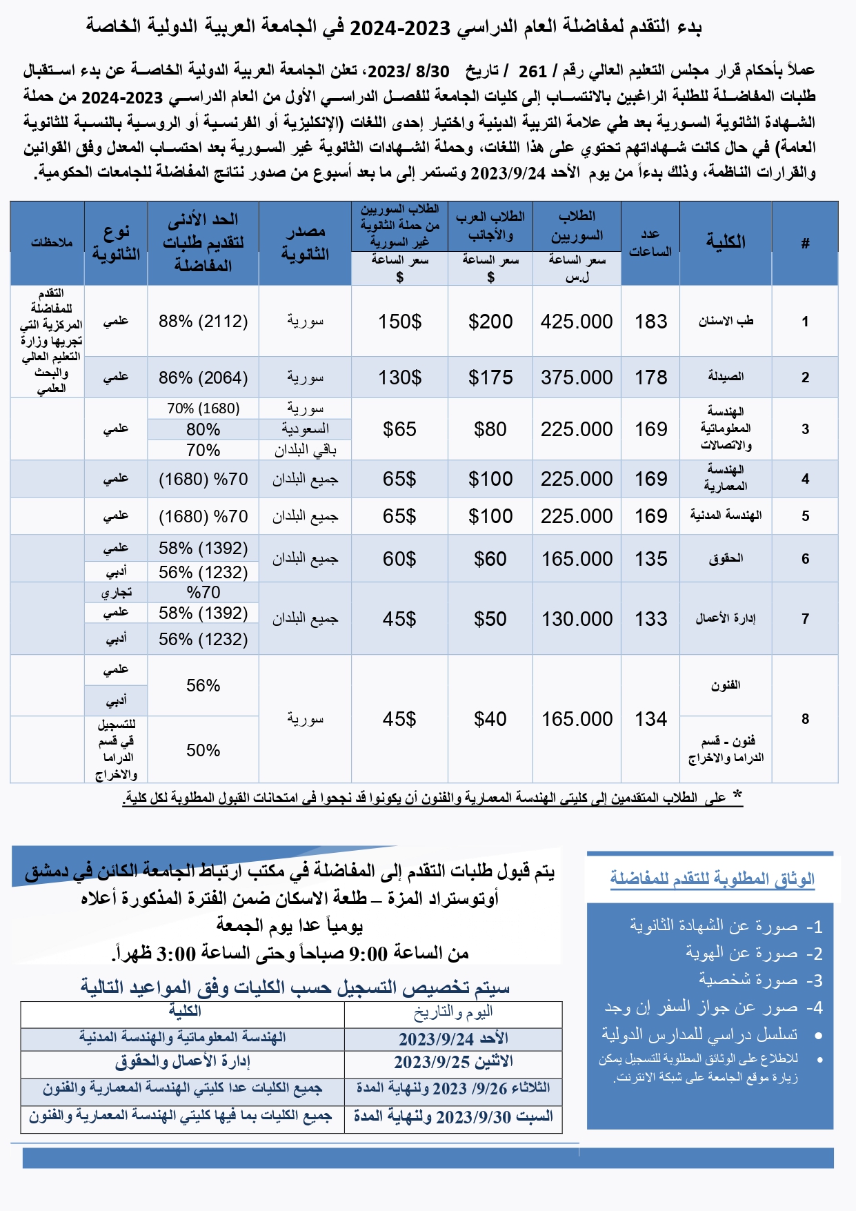 إعلان بخصوص بدء التقدم لمفاضلة العام الدراسي 2023-2024 في الجامعة العربية الدولية