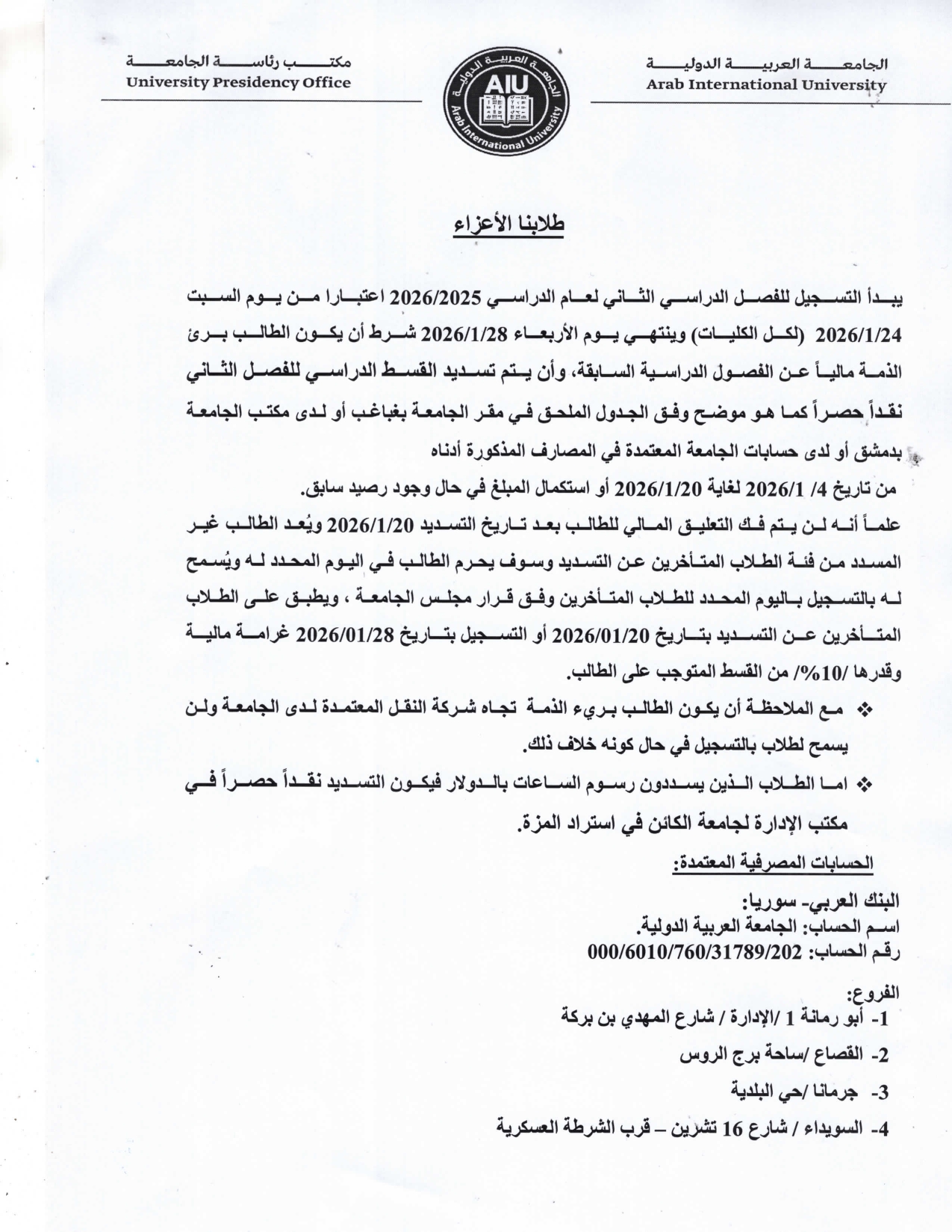اعلان تسديد دفعة الفصل الثاني للعام الدراسي 2025-2026