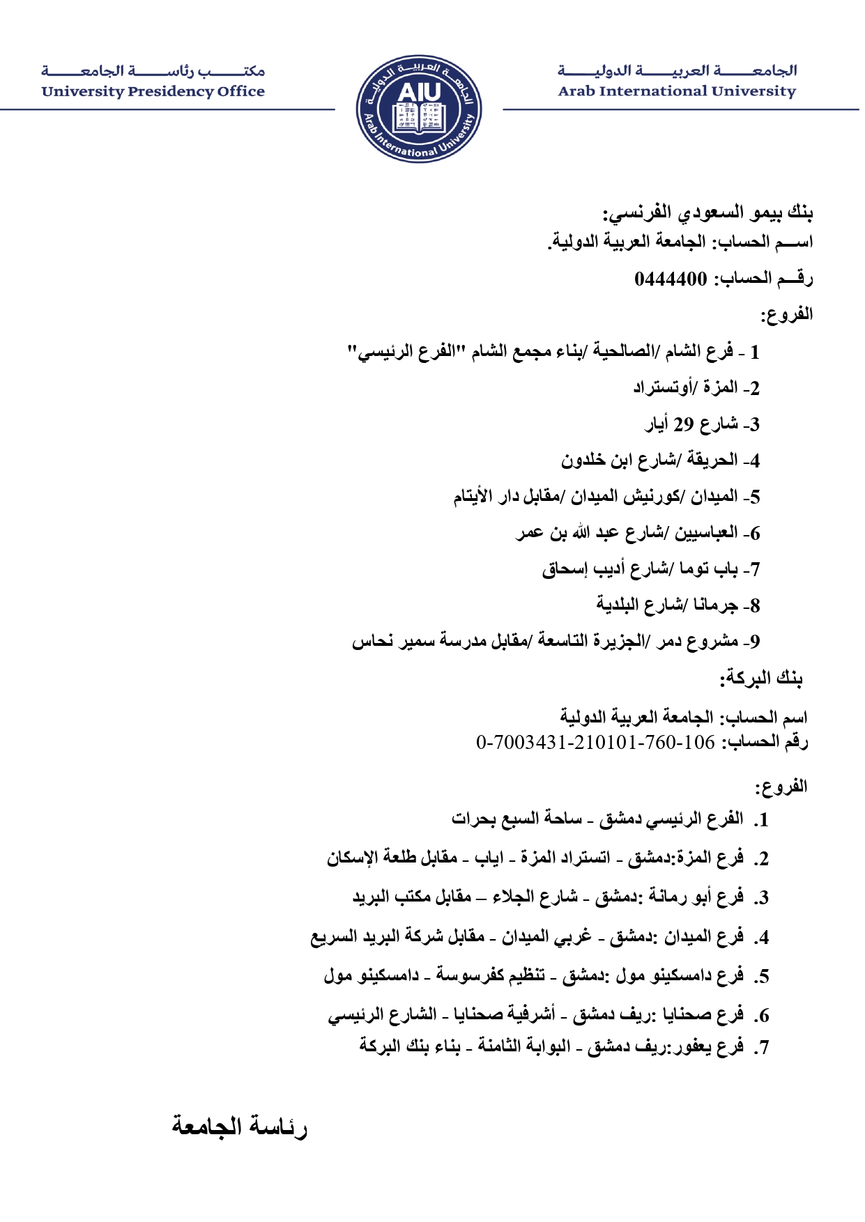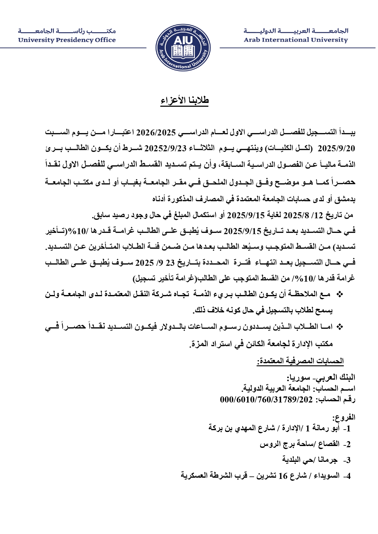 اعلان بخصوص بدء العام الدراسي 2025-2026 في الجامعة العربية الدولية