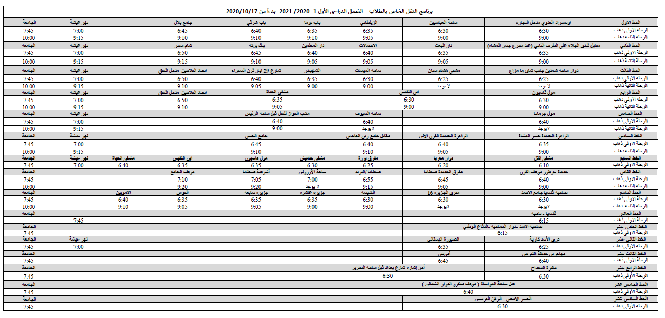 برنامج النقل الخاص بالطلاب - الفصل الدراسي الأول 1- 2020/ 2021- بدءاً من 2020/10/17