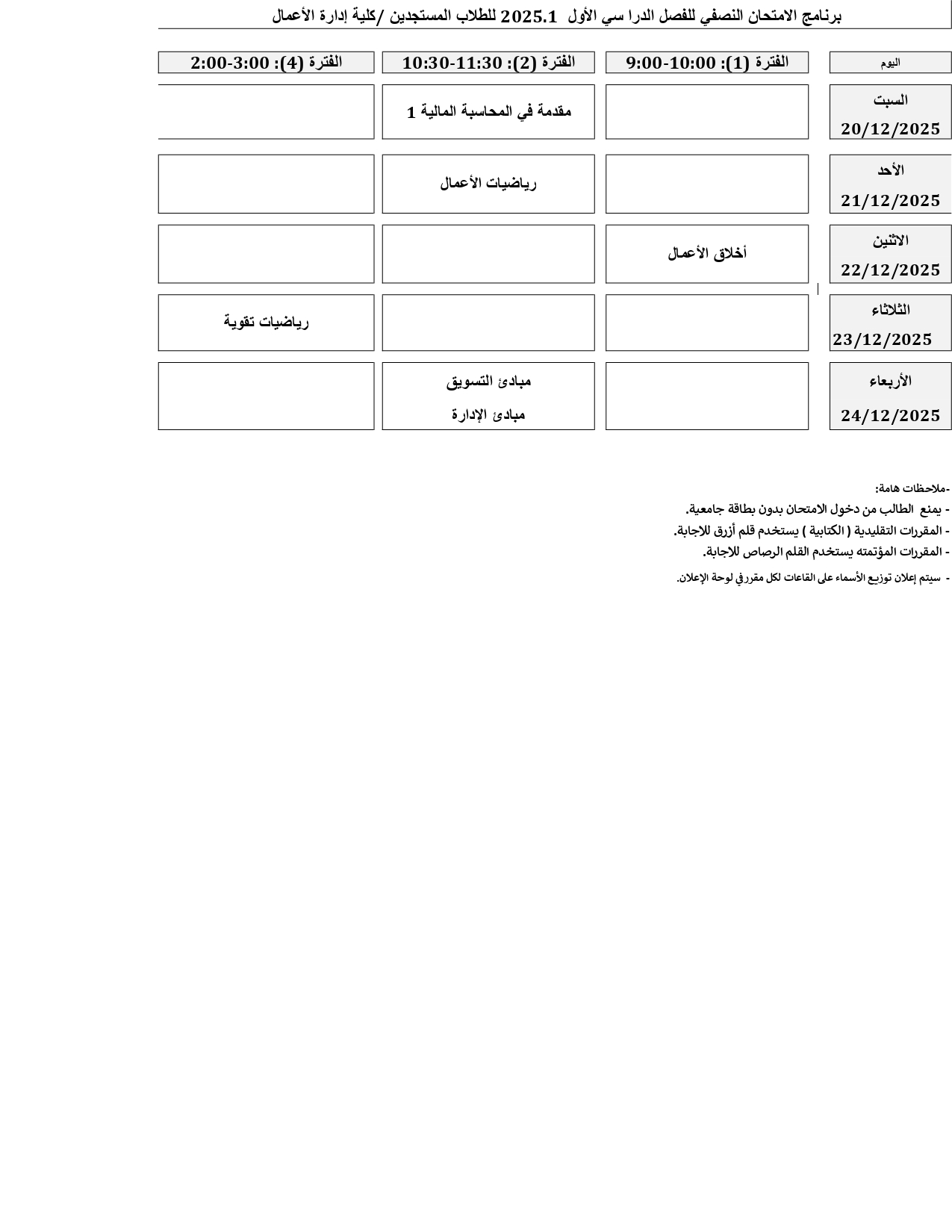 برنامج الامتحان النصفي للفصل الدرا سي الأول 2025.1 للطلاب المستجدين /كلية إدارة الأعمال