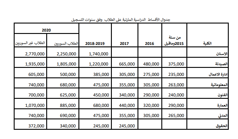 يبدأ التسجيل للفصل الدراسي الاول لعام 2020/2021 اعتبارا من يوم السبت 2021/9/25 (لكل الكليات) وينتهي يوم الأربعاء 2021/9/29 شريطة أن يكون الطالب برئ الذمة مالياً عن الفصول الدراسية السابقة، وأن يسدد قسط الفصل الدراسي الاول المبينة وفق الجدول الملحق من تاريخ 12 / 9 /2021 لغاية 22 / 9 /2021 كحد أقصى أو استكمال المبلغ في حال وجود رصيد سابق .