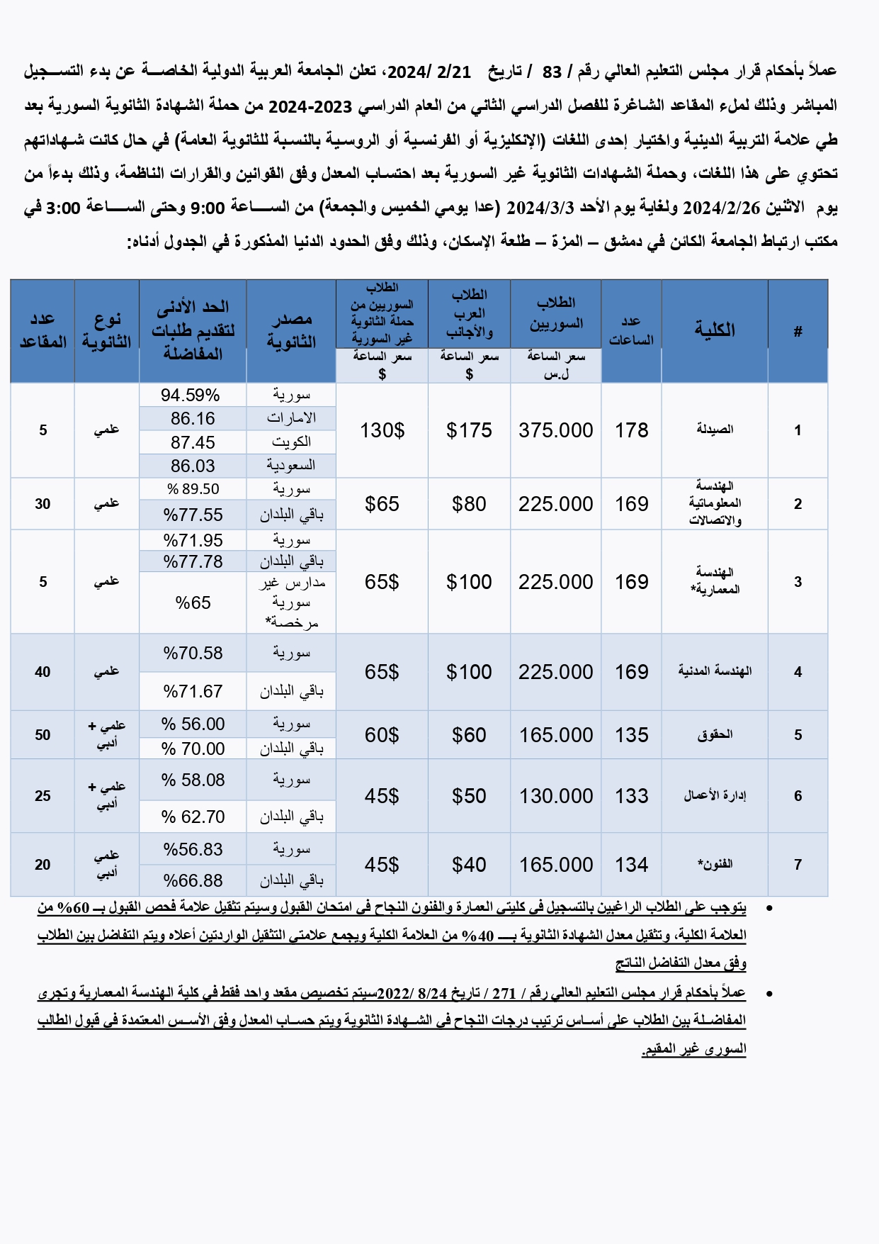 بدء التسجيل المباشر لملء المقاعد الشاغرة في الفصل الدراسي الثاني من العام 2023-2024 في الجامعة العربية الدولية الخاصة