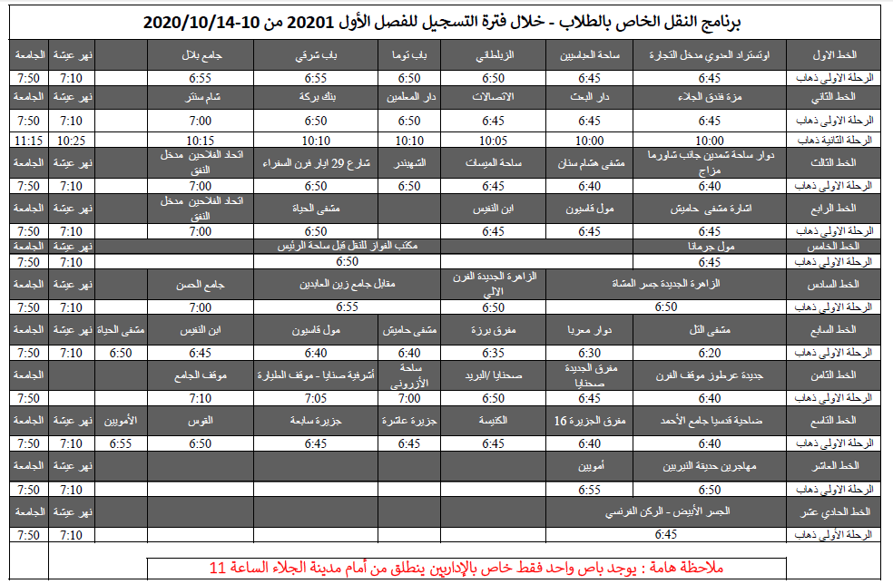برنامج النقل الخاص بالطلاب - خلال فترة التسجيل للفصل الأول 20201 من 10-2020/10/14