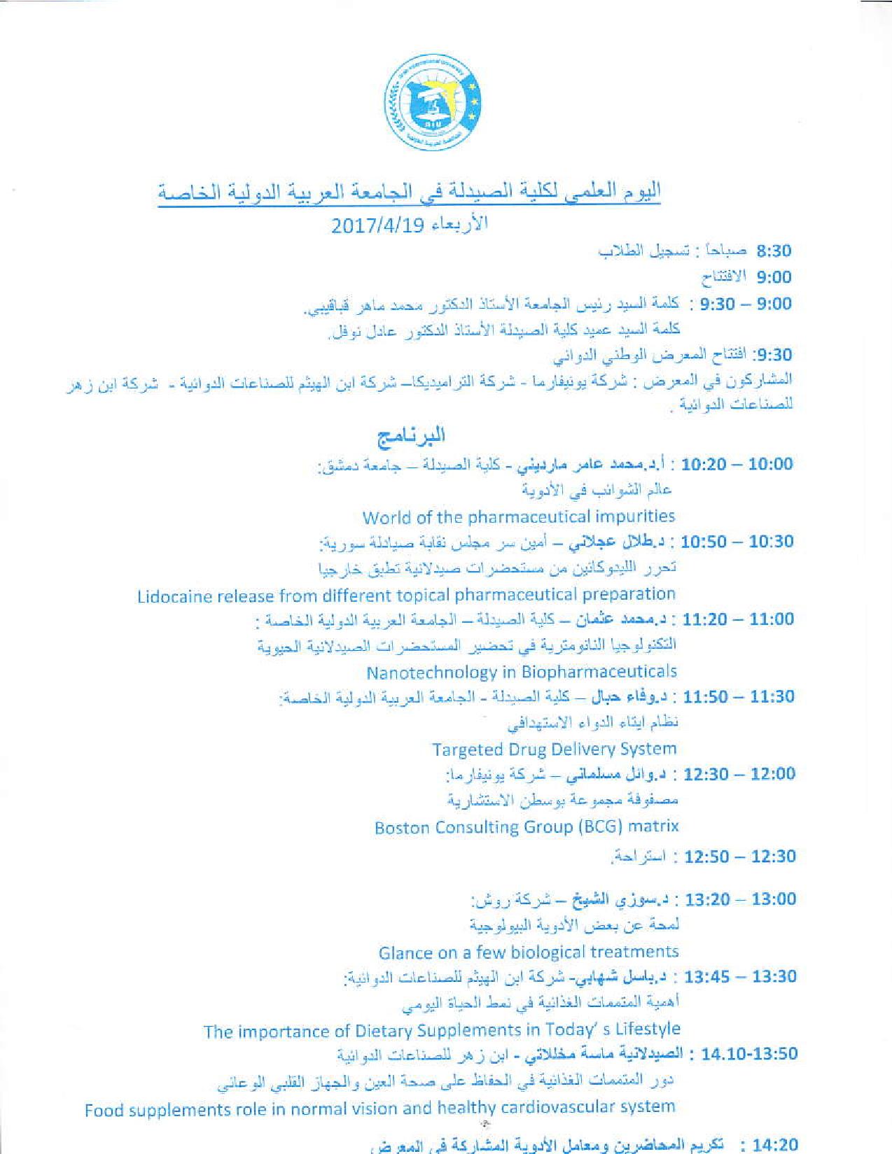 برنامج اليوم العلمي لكلية الصيدلة في الجامعة العربية الدولية الخاصة