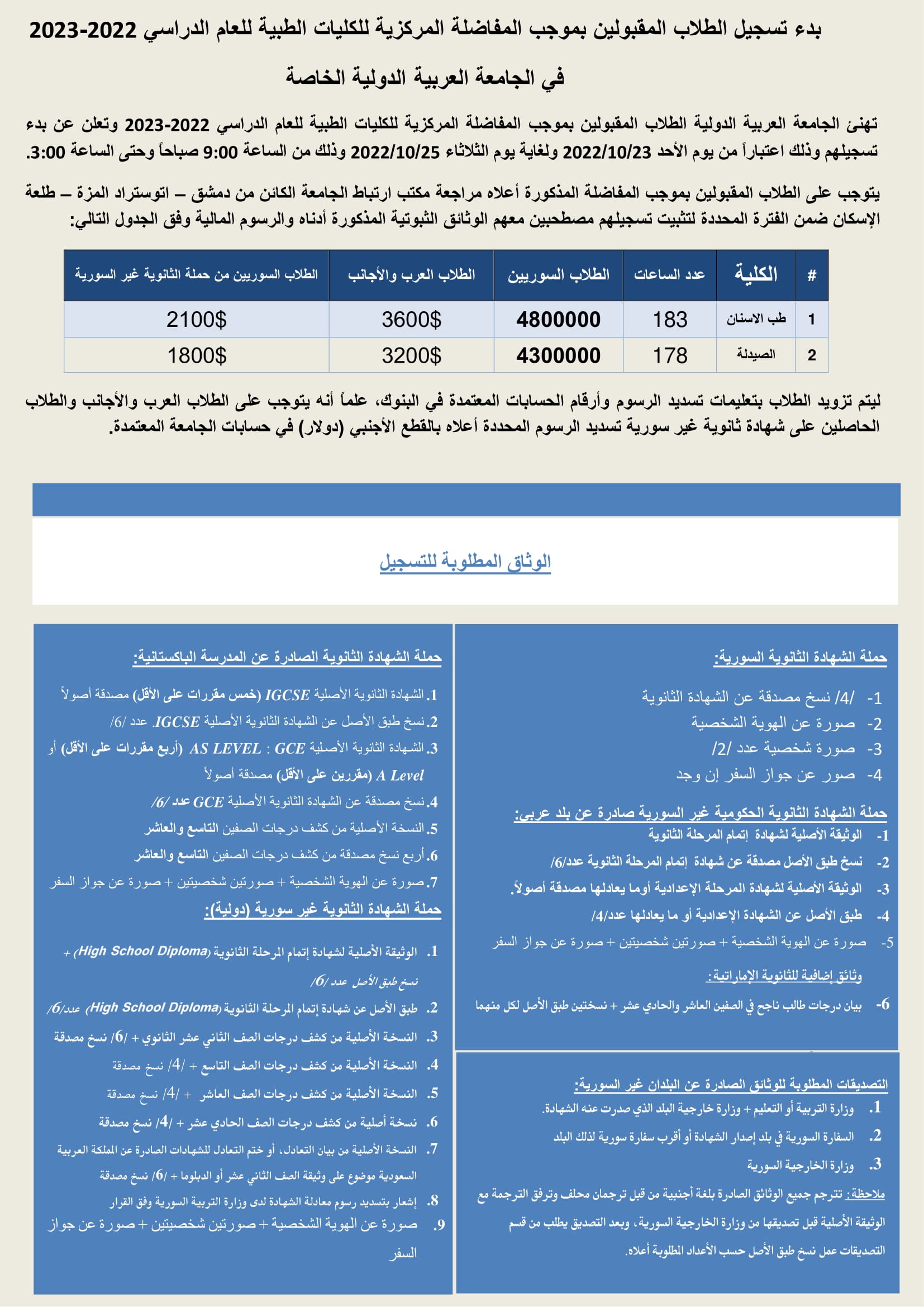 إعلان بخصوص بدء تسجيل الطلاب المقبولين بموجب المفاضلة المركزية للكليات الطبية للعام الدراسي 2022-2023 في الجامعة العربية الدولية