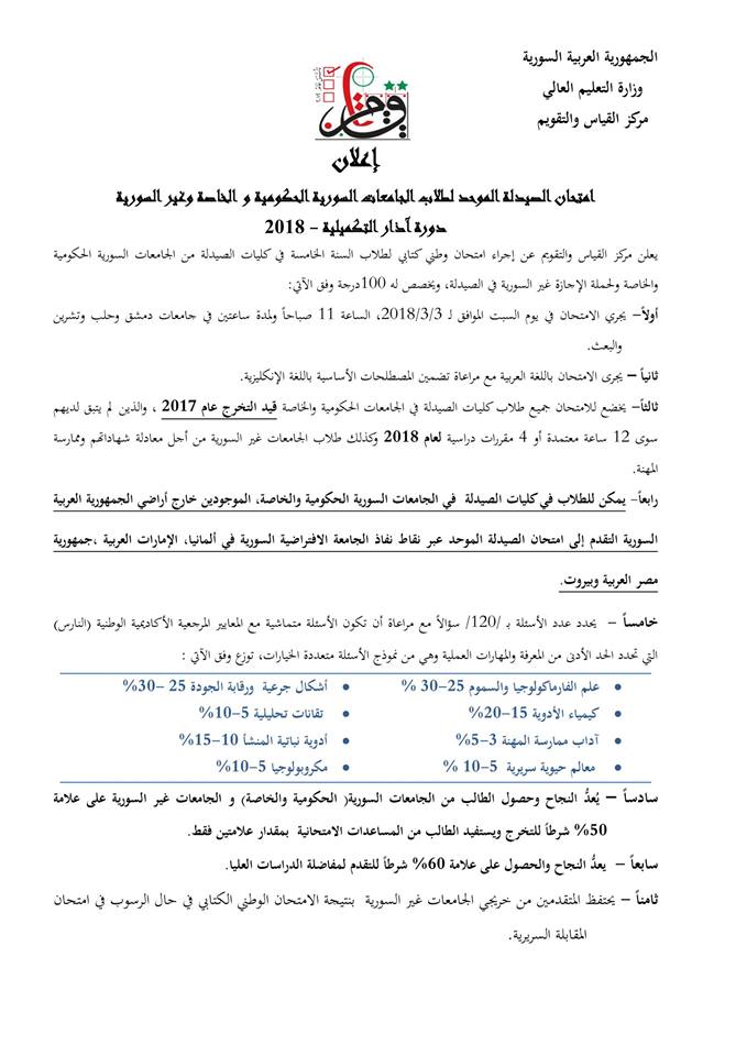 إعلان بخصوص موعد امتحان الصيدلة الموحد دورة آذار 2018