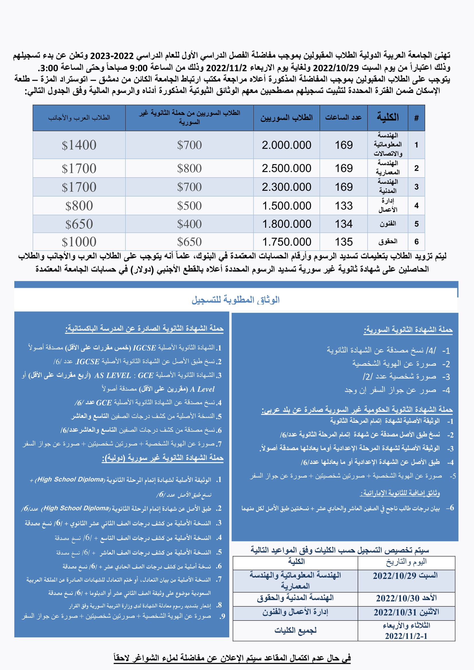 الطلاب الأعزاء للإطلاع على أسماء الطلاب المقبولين في نتائج مفاضلة الفصل الدراسي الأول من العام الدراسي 2022-2023 في الجامعة العربية الدولية يرجى الضغط على الروابط التالية