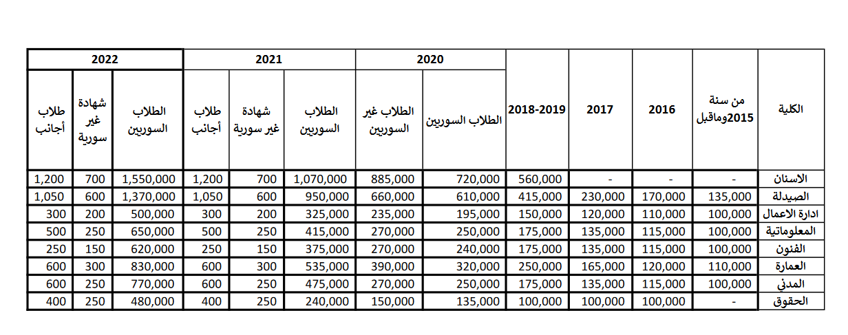 الحقوق – الإدارة – الفنون – طب الأسنان |