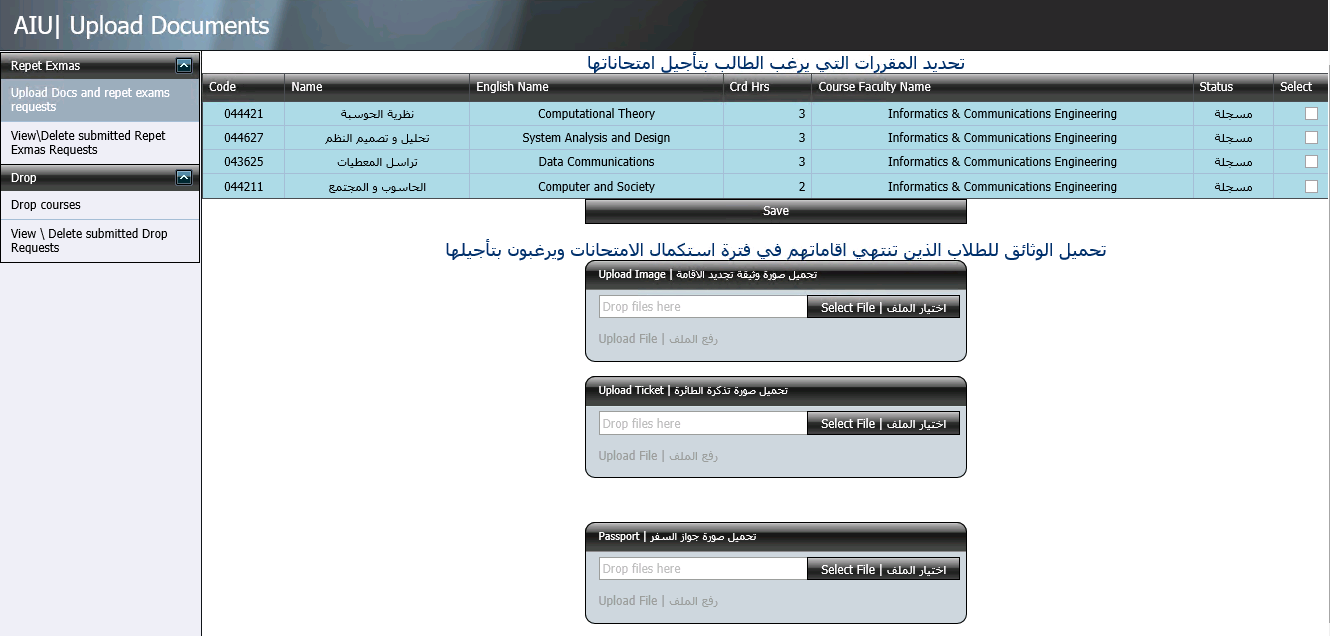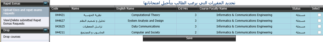 بحيث يقوم الطالب بتحديد المقررات التي يرغب بتأجيل امتحاناتها ويقوم بالضغط على زر Save