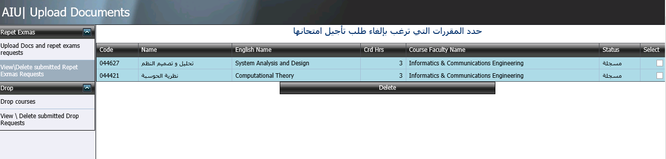 يمكن للطالب استعراض المقررات التي تقدم بطلب لتأجيل امتحاناتها، وكذلك تعديل طلبه بالضغط على رابط الانتقال "View Delete submitted Repeat Exams Request" والموجود في لوحة الانتقال الظاهرة على اليسار، بحيث تظهر المقررات التي حددها الطالب: