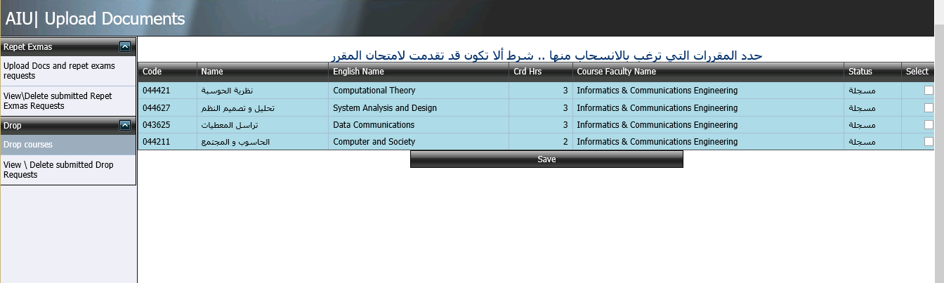 3- يقوم الطالب بتحديد المقررات التي يرغب بالانسحاب منها (Drop) شريطة ألا يكون قد تقدم لامتحان المقرر النهائي ويقوم بعدها بالضغط على زر Save لتثبيت الطلب، وسيطلب من الكليات التحقق من عدم تقدم الطلاب المتقدمين بطلبات انسحاب من المقررات للامتحانات النهائية سابقا.