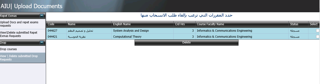 4- يمكن للطالب استعراض المقررات التي طلب الانسحاب وكذلك تعديل طلبه بالضغط على رابط الانتقال "View Delete Drop Courses" والموجود في لوحة الانتقال الظاهرة على اليسار، بحيث تظهر المقررات التي رغب الطالب بالانسحاب منها: