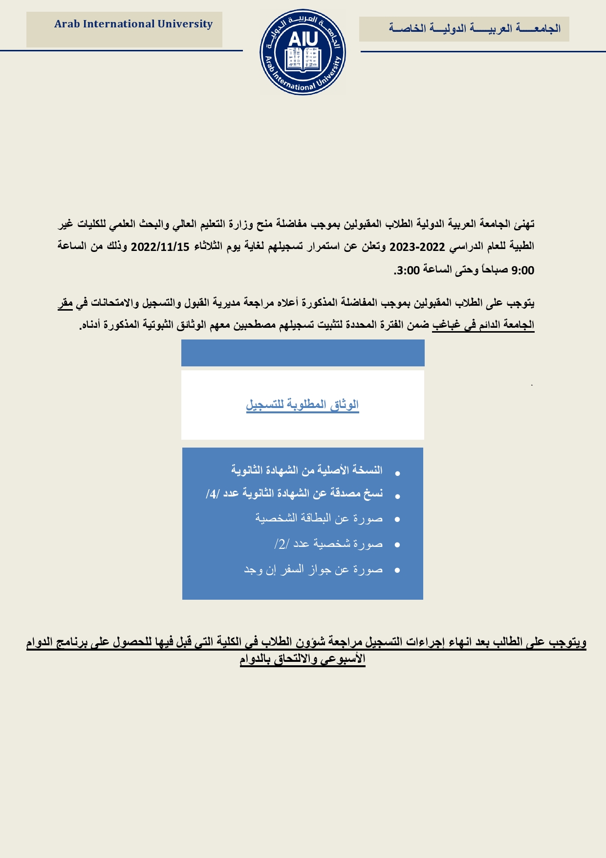 تسجيل الطلاب المقبولين بموجب مفاضلة منح وزارة التعليم العالي والبحث العلمي للكليات غير الطبية للعام الدراسي 2022-2023 في الجامعة العربية الدولية الخاصة