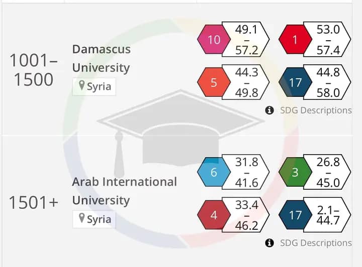الجامعة العربية الدولية تأتي في المركز الثاني في ترتيب الجامعات السورية الستة المصنفة، في تصنيف التايمز 2025. يجدر بالذكر ان هناك عدد من الجامعات السورية قد أدرجت جميعها بالفئة +1501 الا ان التصنيف قد أدرجها بتسلسل يبين تقدمها عن بعضها البعض. وقد تفوقت الجامعة العربية الدولية عن الجامعات السورية في مؤشر نوعية التعليم (Quality Education) الذي وضعها في هذه المرتبة بالإضافة الى باقي أهداف ال17 للتنمية المستدامة.
