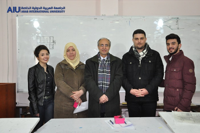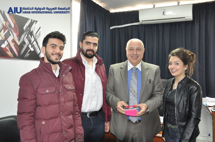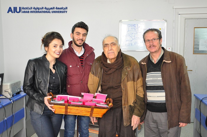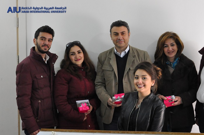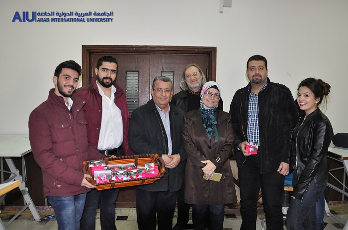A number of Arab International University students distributed symbolic gifts and commemorative cards to university professors celebrating the Teacher's Day.