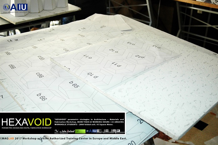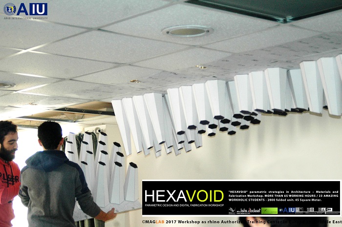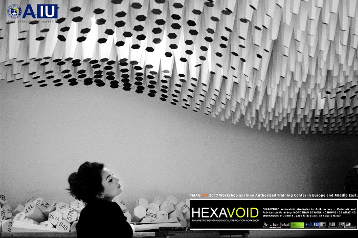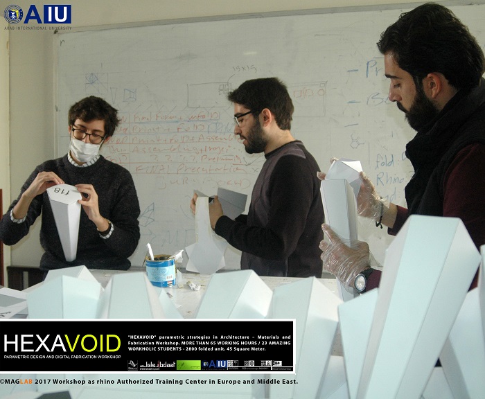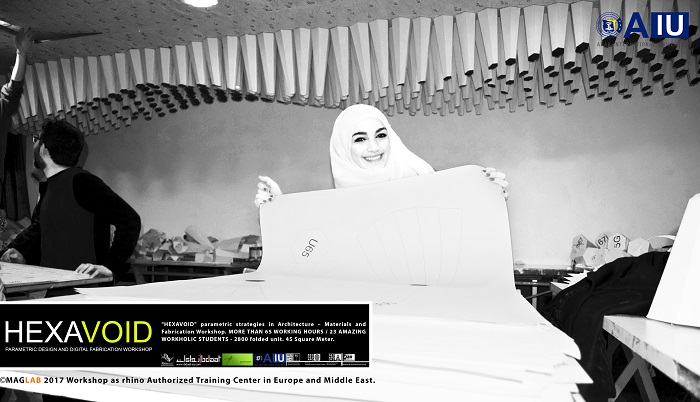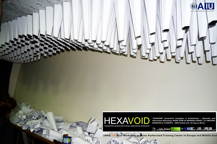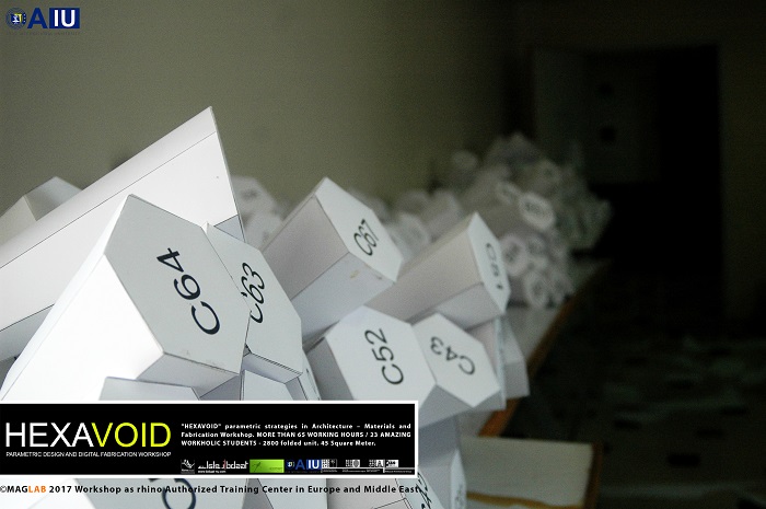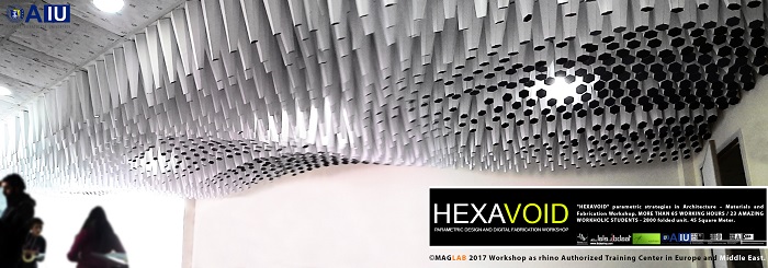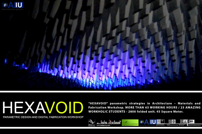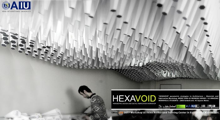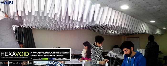 HEXAVOID Parametric design and Fabrication workshop 2017 "HEXAVOID" parametric strategies in Architecture – Materials and Fabrication Workshop. MORE THAN 65 WORKING HOURS / 23 AMAZING WORKHOLIC STUDENTS - 2800 folded unit. 45 Square Meter. Parametric design, Art and digital Fabrication Workshop “HEXAVOID 2017” In the intensive 7 days’ full time Workshop; we focused exclusively on introducing Morphogenesis, evolving strategies in architecture, Pattern finding and optimizing complex geometry in conjunction with economic efficiency, environmental impact. Participants experimented with new techniques, strategies using 3ds max and Rhino understanding of all stages from parametric design to digital manufacturing.