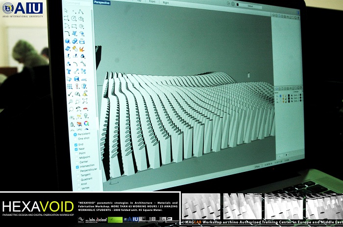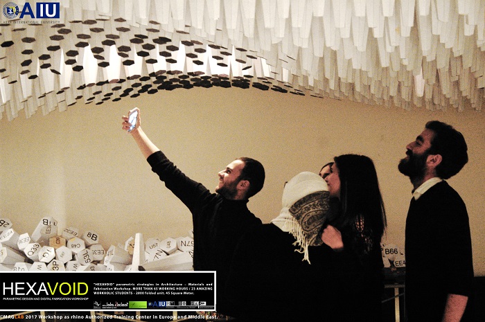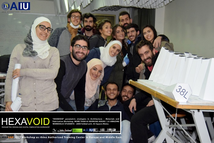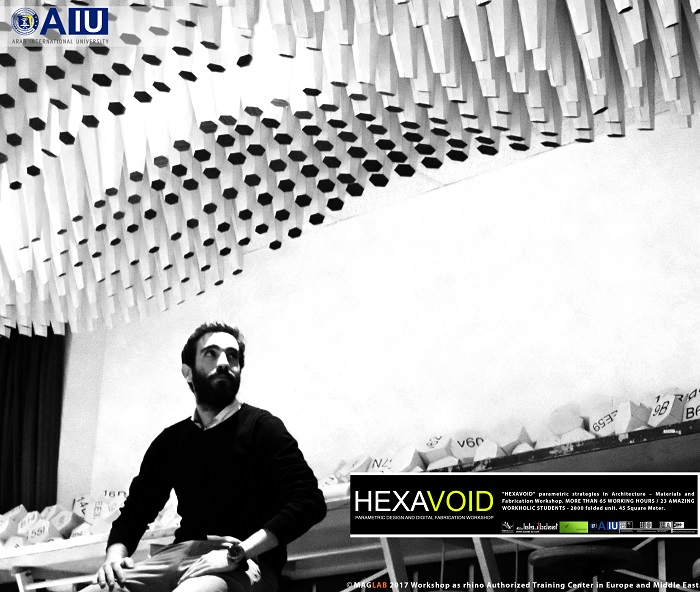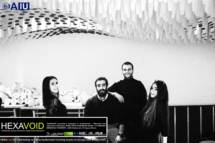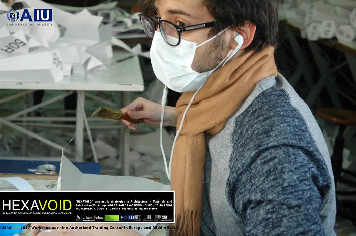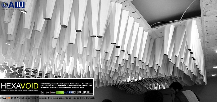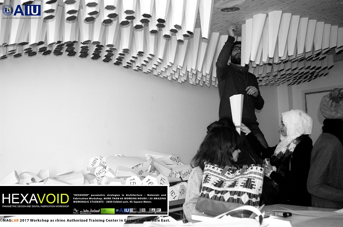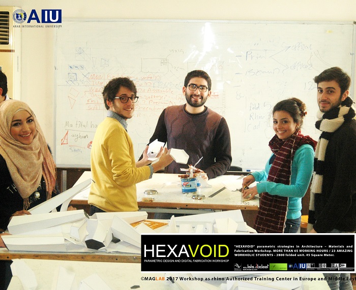 HEXAVOID Parametric design and Fabrication workshop 2017 "HEXAVOID" parametric strategies in Architecture – Materials and Fabrication Workshop. MORE THAN 65 WORKING HOURS / 23 AMAZING WORKHOLIC STUDENTS - 2800 folded unit. 45 Square Meter. Parametric design, Art and digital Fabrication Workshop “HEXAVOID 2017” In the intensive 7 days’ full time Workshop; we focused exclusively on introducing Morphogenesis, evolving strategies in architecture, Pattern finding and optimizing complex geometry in conjunction with economic efficiency, environmental impact. Participants experimented with new techniques, strategies using 3ds max and Rhino understanding of all stages from parametric design to digital manufacturing.