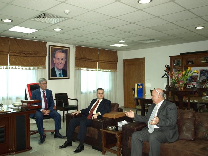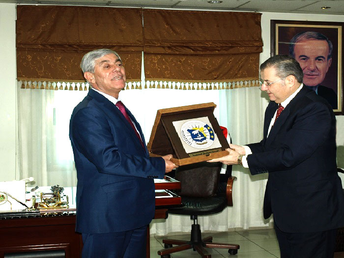 In the framework of continuous cooperation and exchange of experiences between the General Sports Federation, represented by Mr. Major General Mowaffak Juma, Chairman of the Federation and the Arab International University, represented by its president Dr. M. Maher Kabakibi to qualify and prepare our students, especially in the field of sports activities and requirements, a delegation from the university consisted of Messrs University President, Vice President for Administrative and Students Affairs, and Head of the University Requirements on Thursday, 16.04.2015 visited the General Sports Federation, where they met with Mr. Major General President of the Federation to discuss aspects of cooperation between the two parties. The two sides exchanged shields of the Federation and of the University as a token of cooperation and loyalty for the common interest between them in qualifying and training the young generation, the generation of students. The two sides affirmed the need to continue this cooperation and development to achieve the desired goals.