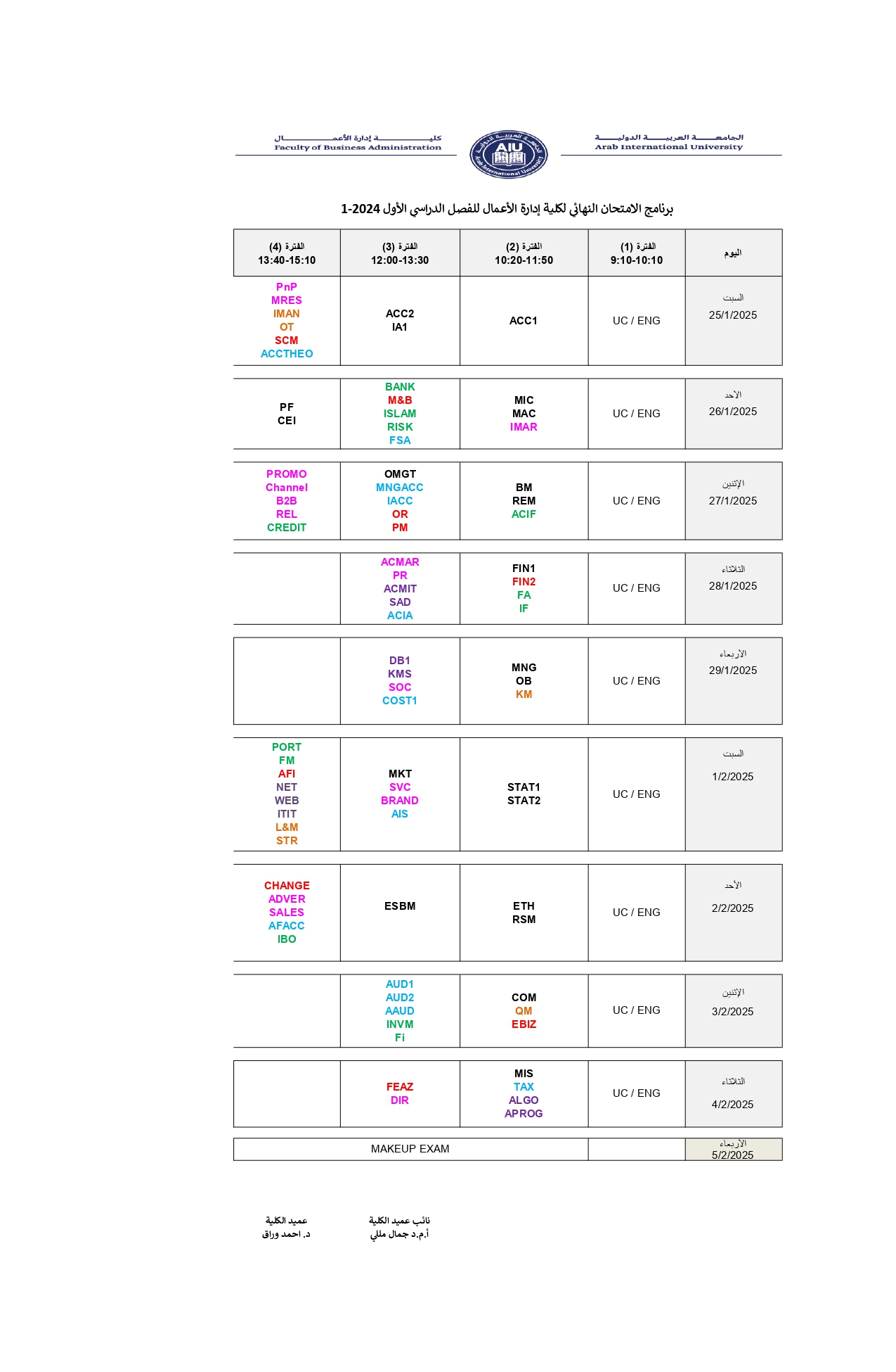 برنامج الامتحان النهائي لكلية إدارة الأعمال للفصل الدراسي الأول 20241-1