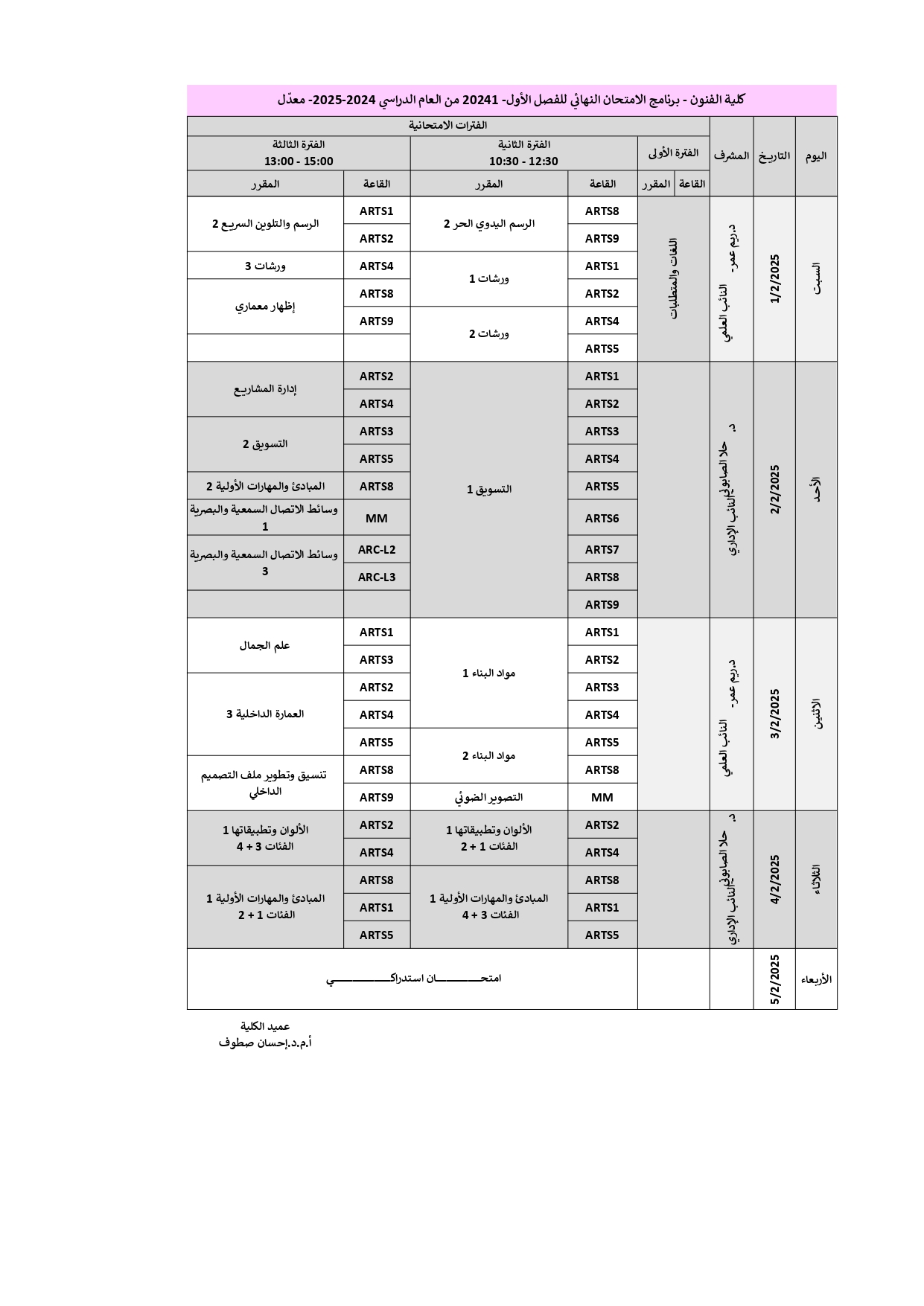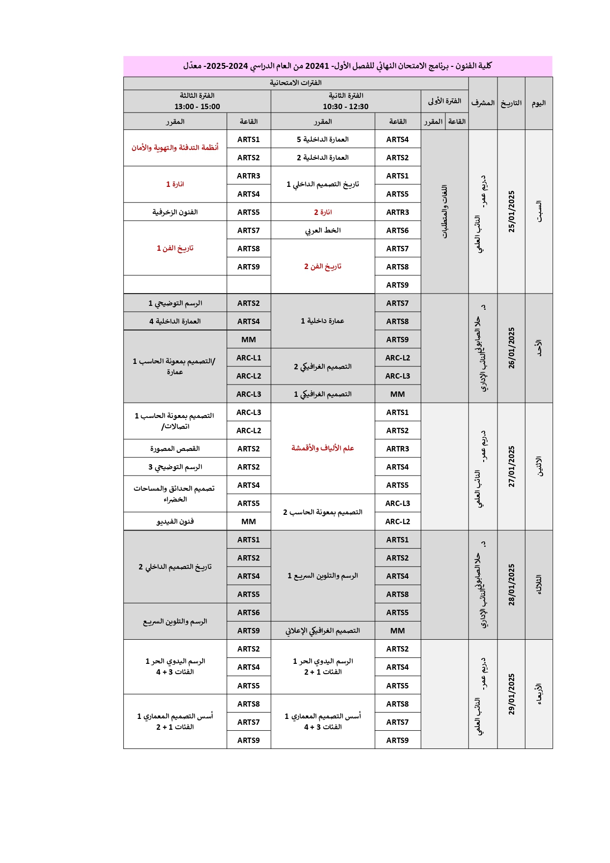 كلية الفنون - برنامج الامتحان النهائي للفصل الأول- 20241 من العام الدراسي 2024-2025