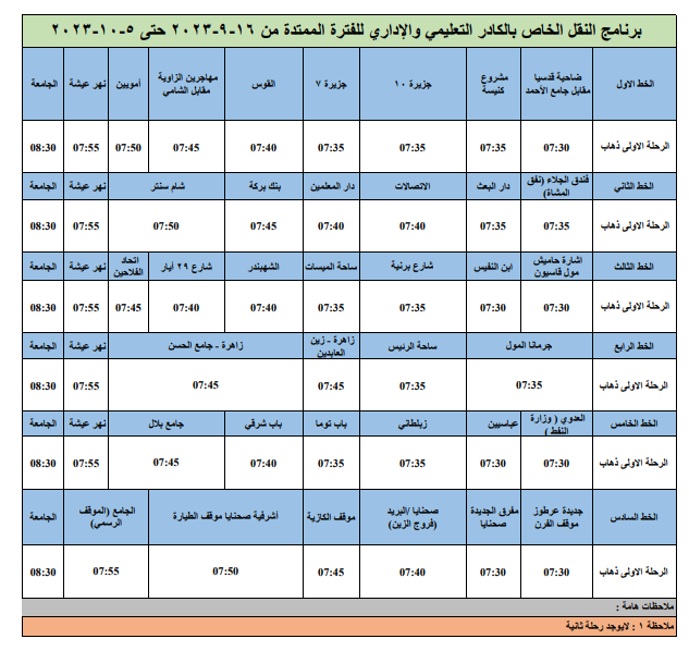 ملاحظة : على الطلاب المسجلين التوجه إلى أماكن انطلاق حافلات الجامعة بحسب مناطق سكنهم وفق برنامج النقل المرفق