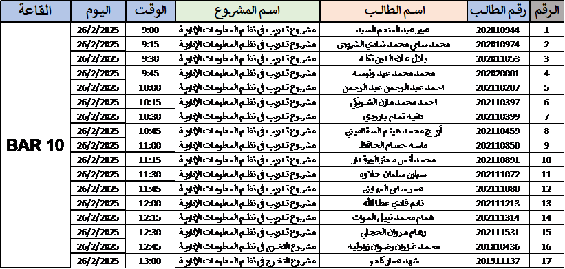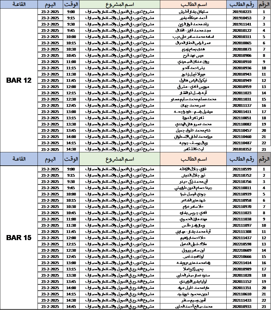 يحدد مواعيد مناقشة مشاريع التدريب 1 و2 وفق المواعيد المرفقة (على الطلاب الإلتزام والتواجد وفق المواعيد المحدد):