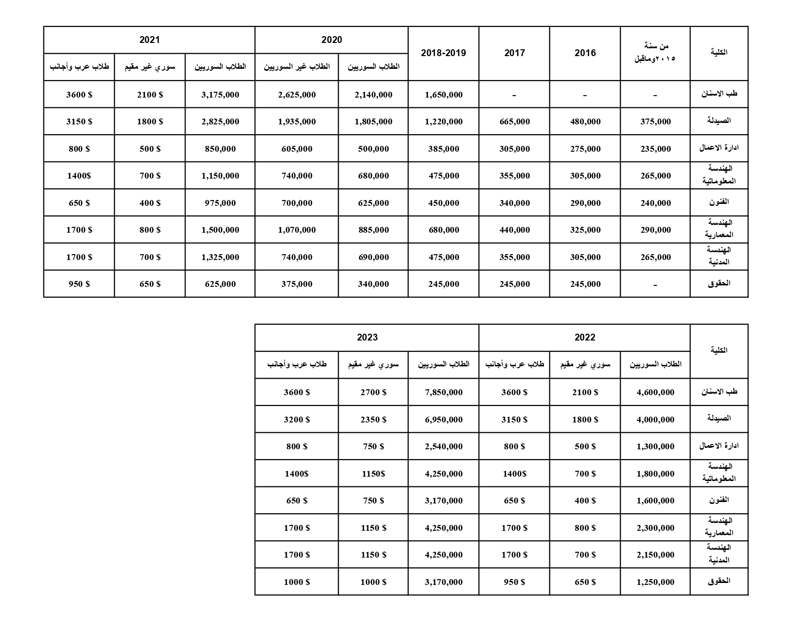 - اما الطلاب الذين يسددون رسوم الساعات بالدولار فيجب عليه مراجعة مكتب المالية في الجامعة بغباغب أو مكتب الإدارة الكائن في استراد المزة للحصول على اشعار تسديد ويكون التسديد حصرا في البنك العربي بكافة فروعه