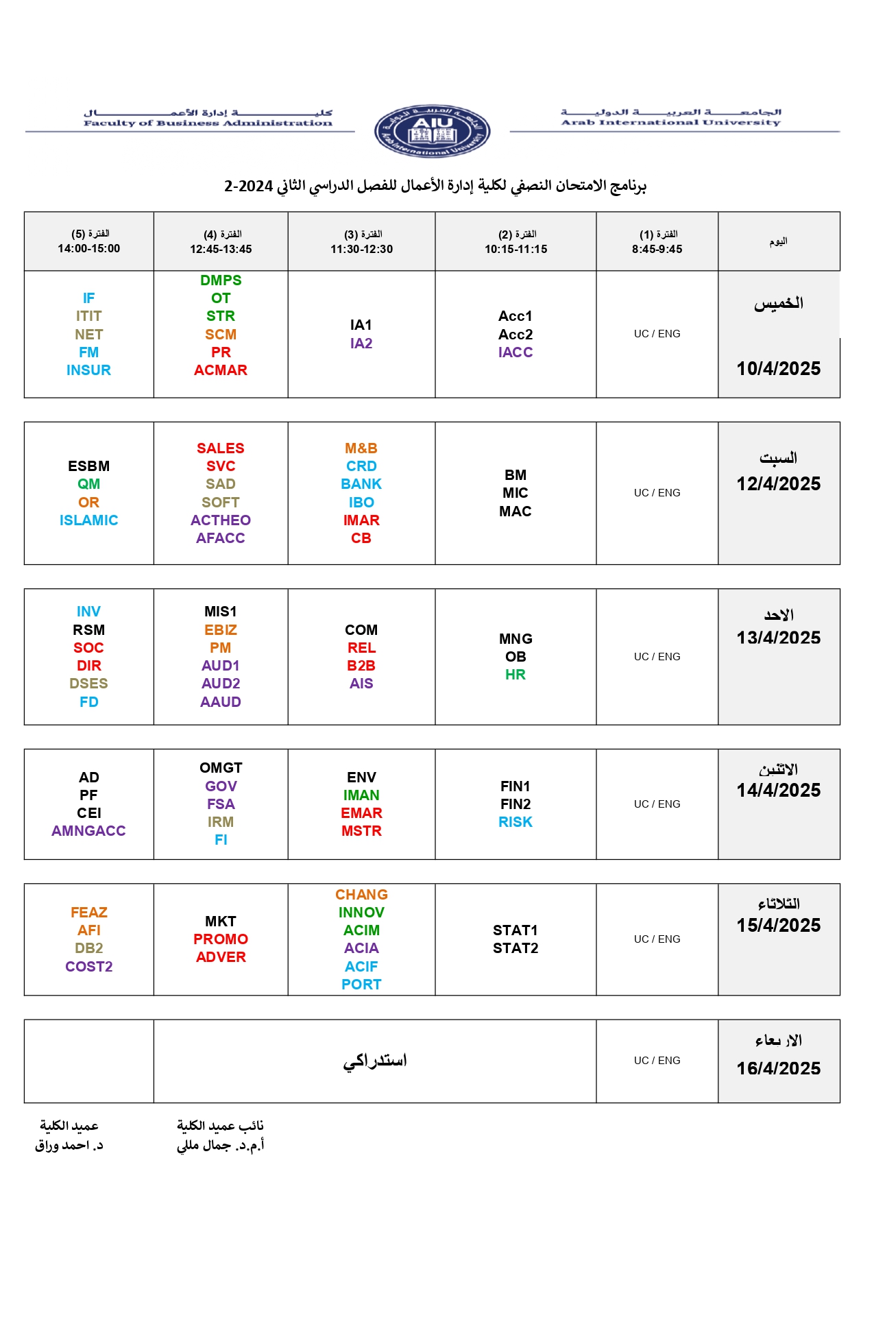 برنامج الامتحان النصفي لكلية إدارة الأعمال للفصل الدراسي الثاني 2024-2