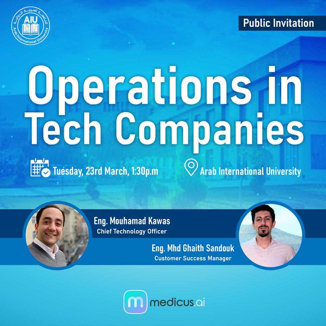 ستقوم شركة Medicus AI ممثلةً بالمهندس محمد قوّاص مدير العمليات التقنية بتقديم محاضرة بعنوان "العمليات في الشركات التقنية / Operations in Tech companies”.