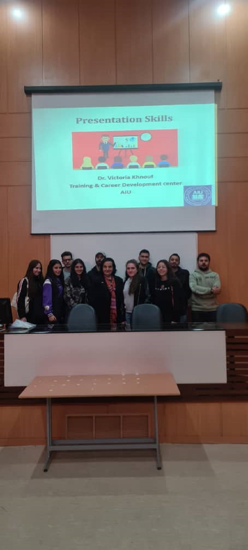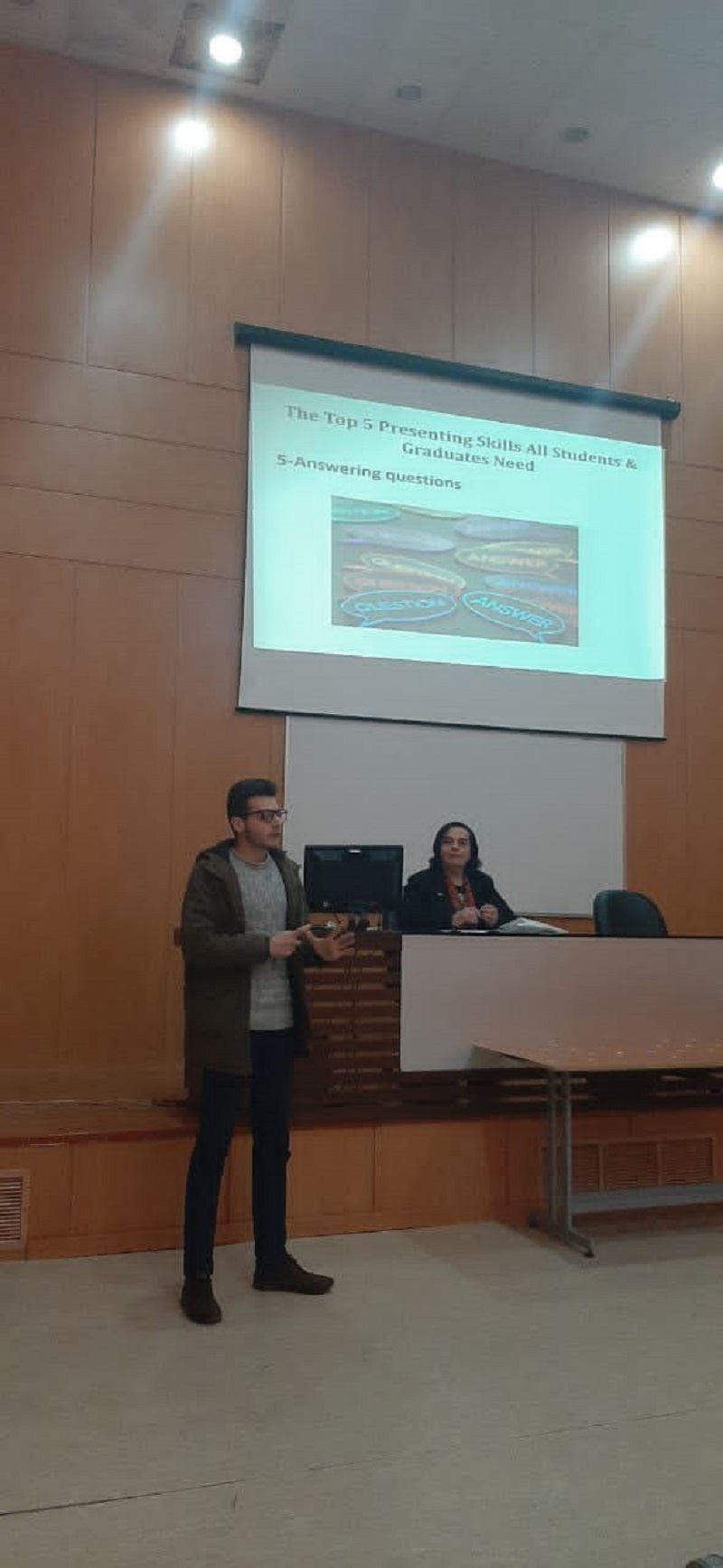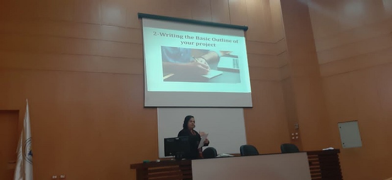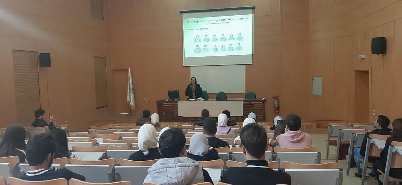 "مهارات العرض" و ذلك من خلال برامج المركز الموجهة الى جميع طلاب الجامعة المعنيين بمشاريع التدريب و التخرج ,على مدرج كلية طب الأسنان بتاريخ 28.3.2023 .